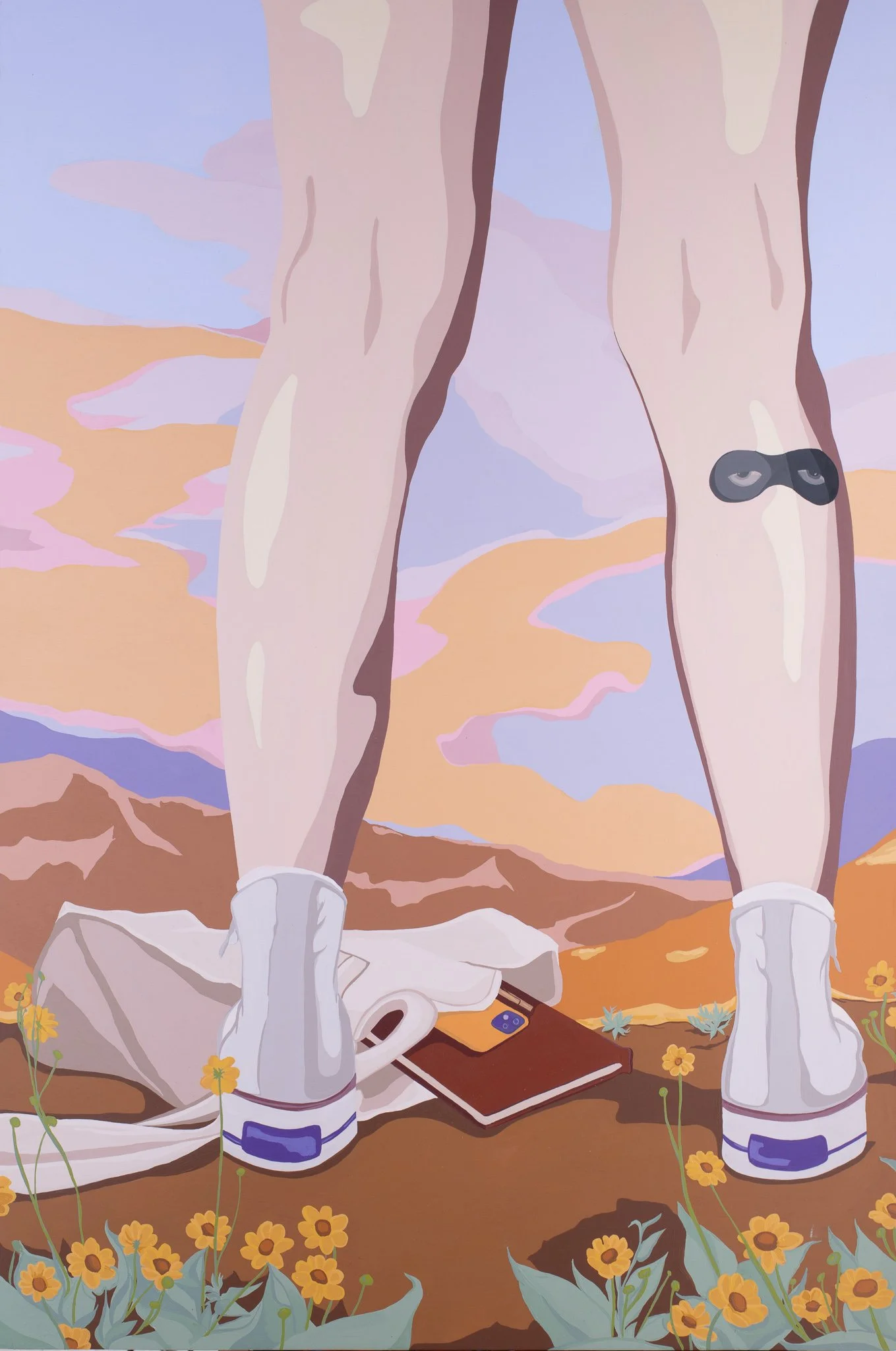 This self-portrait overlooks Sycamore Canyon, a favorite local hiking spot. The small desert flowers and shapes of the hills in the distance feel like a familiar friend, and a bag lays at her typically converse-clad feet, phone, and all other distractions put aside for a moment of appreciation of a California sunset.